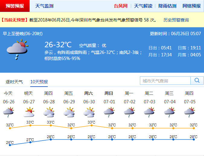 深圳市气象台预计明天多云,有阵雨或雷阵雨;26-32℃;南风2-3级;27-30日天气炎热到酷热,午后易发局地短时热雷雨,最高气温33-34℃,局地35℃或以上,请市民做好防暑降温,户外活动时多补充水分,长时间户外工作者,感到不适时,应到阴凉处休息,另外,午后易发生局地短时雷雨,及时关注最新气象预报预警信息,避免对出行或活动照常影响。