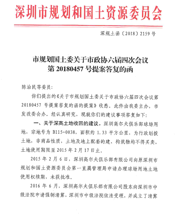 深圳新闻网记者注意到,2018年6月21日规土委给陈治民等政协委员的回复函中,将深圳高尔夫俱乐部球场用地到期后发生的事情,一一列了出来:
