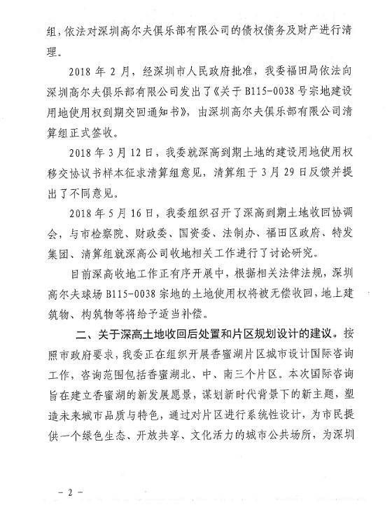 2018年2月,经深圳市人民政府批准,深圳市规土委依法向深圳高尔夫俱乐部有限公司发出了《关于B0015-0038宗地建设用地使用权到期交回通知书》,由深圳高尔夫俱乐部有限公司清算组正式签收。