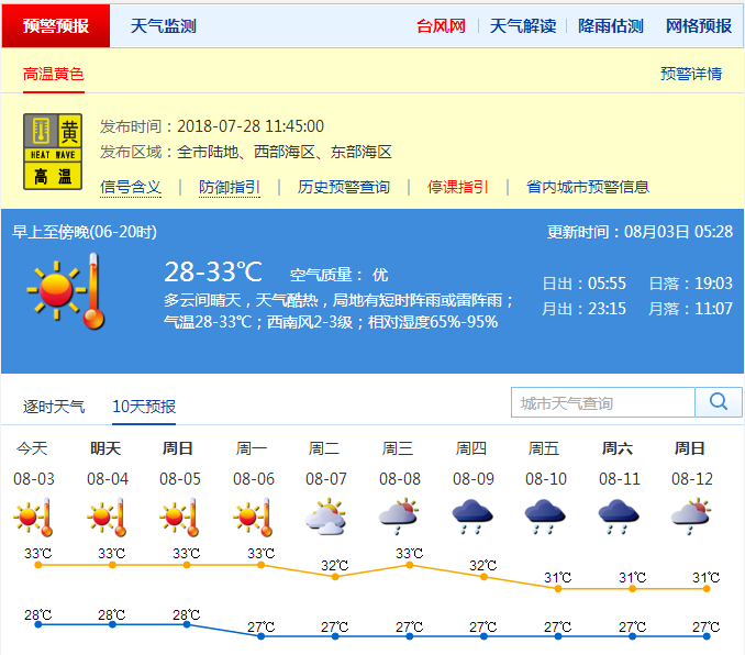 近期天气方面,预计3日多云间晴天,天气酷热,局地有短时阵雨或雷阵雨,气温27-33℃,北部和人口密集区局地最高气温可达35℃;4-7日多云,局部有短时(雷)阵雨。请注意持续高温下的防暑降温和户外活动、户外作业的安全;关注局地雷雨的影响,发布雷电预警时,需远离高山、开阔的地方以及树下、较浅的山沟或者山洞、水面等地区。