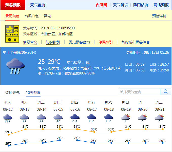 市气象台预测,13日降雨减弱,有阵雨,局部大雨。14-15日,多云有阵雨,气温上升,最高气温指向33℃。