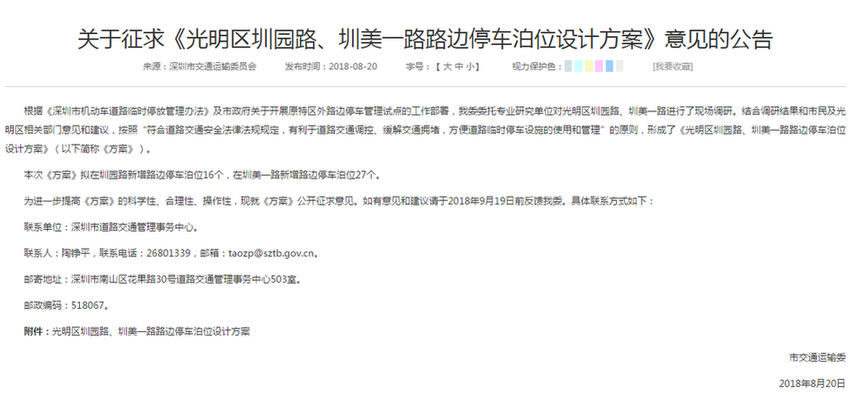 深圳新闻网8月20日讯(记者 涂胜)8月20日下午,深圳市交委发布消息称,光明新区拟设置“宜停车”泊位,位于圳园路和圳美一路,共设43个泊位。