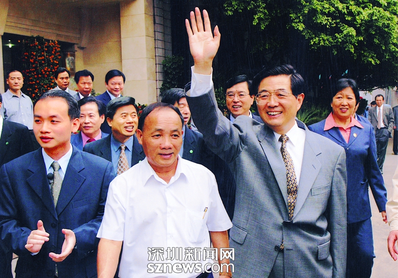 2003年4月12日,胡锦涛同志(前排右一)视察南岭村,老书记张伟基(右二)陪同,张育彪也是陪同人员(左一)