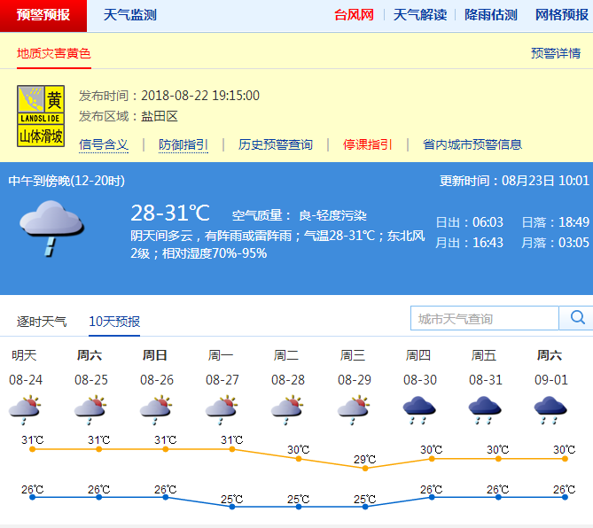 市气象台预测,24日-29日,多云到阴天,有阵雨或雷雨,部分时间雨势较大。最低气温26℃左右,最高气温31℃左右。近来深圳降雨较多,容易导致泥土松动,市民外出应注意远离边坡等危险地带。(记者 李秀瑜)