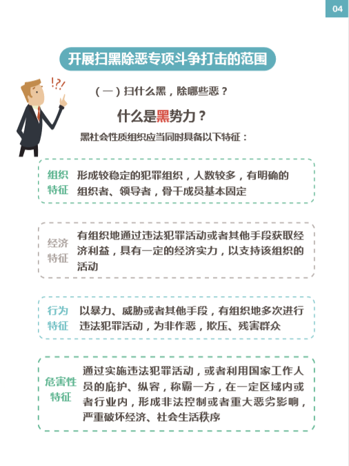 扫黑除恶普法“口袋书”是一本“普法书”,内容共涉及11大类,分别是开展扫黑除恶专项斗争的重大意义、总体要求、目标任务、基本原则、打击的范围,以及扫黑除恶宣传标语、宣传海报,扫黑除恶进行时,深圳市扫黑除恶专项斗争举报奖励办法,深圳市扫黑除恶办关于市、区、各行业扫黑除恶专项斗争举报电话的公告,涉黑涉恶类犯罪相关罪名及法律条文。“口袋书”是一本“明白书”,以图文相结合的方式,内容提纲挈领,语言精炼,通俗易懂,把扫黑除恶专项斗争的有关法律、政策法规进行准确、细致的解读,明明白白地交给市民。“口袋书”又是一本“方便书”,版式设计活泼,书体轻便,可随身携带,方便阅读。