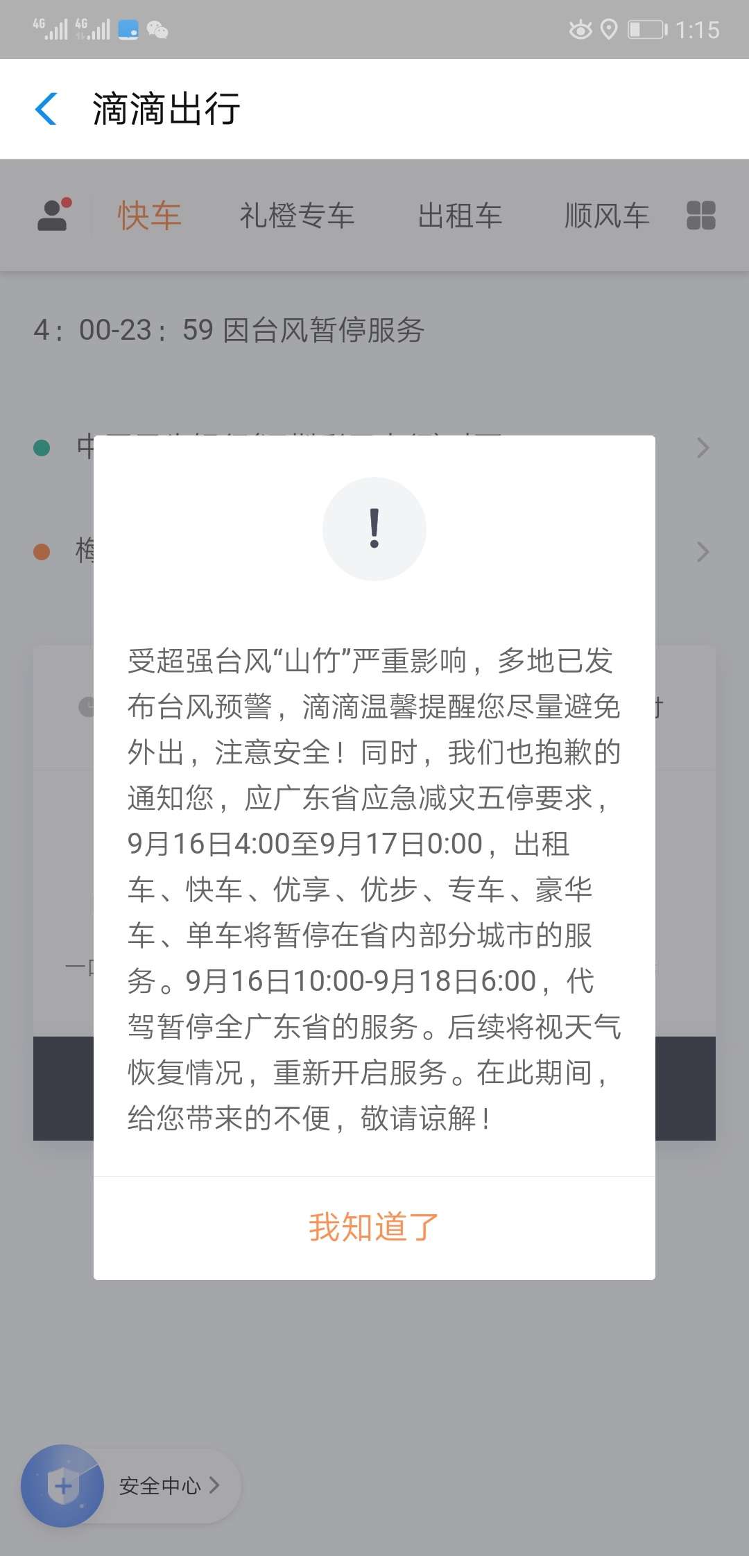 9月16日10:00-9月18日6:00,代驾暂停全广东省的服务。后续将视天气恢复情况,重新开启服务。