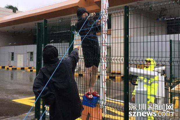 此时,警戒哨位的闸杆被风吹得摇摇欲坠,技术民警不顾危险第一时间爬上闸机,用铁丝和绳索将闸杆加固,并对道闸进行了成功的抢修。