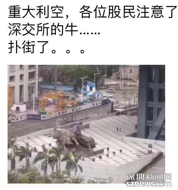 深圳新闻网9月18日讯(记者 张玲 实习生欧阳子瑜 张林羽 陆宇)关于“山竹”的各种段子特别多,博君一笑,未必是真。记者18日发现,有一张像素极低的图在网上流传,照片中一头牛雕塑卧倒在地,配文是:重大利空,各位股民注意了,深交所的牛,扑街了……
