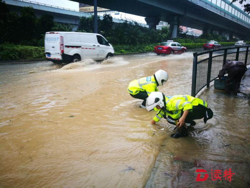 但是,眼前的情况,他们无法视而不见。深盐二通道下方,罗沙路罗湖公安分局调头口处,当艾力军经过这里时发现由于地势低洼路面已经严重积水,他们马上停下车,疏通下水道。一行人在风雨中走进机动车道,沿着路边只能用手在积水中摸索排水口的位置,将阻塞入水口的树枝树叶掏出来。但风急雨骤,道路积水水位刚下降一点,刚被清理的下水道又堵树叶、树枝等杂物堵上,他们只好不断地进行着重复的动作。而此时,台风“山竹”距离深圳接近130公里,罗湖片区测得最大阵风达16级。