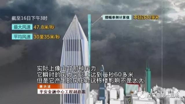 工程人员表示,平安金融中心抗风设计能应对平均风速为60米/秒,阵风风速最高至80米/秒的台风。在此模拟情景下,塔顶摆幅单侧计算值为67厘米。