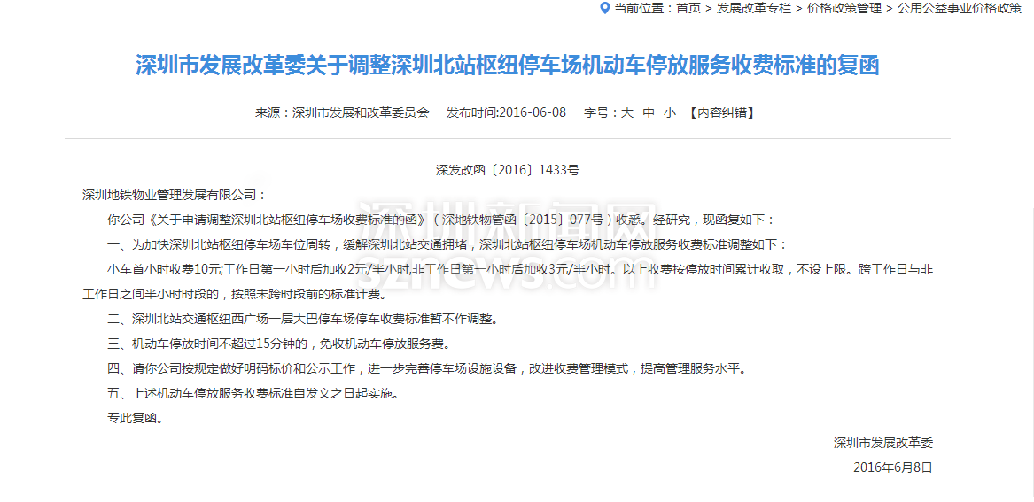 2016年深圳市发改委调整深圳北站停车收费政策