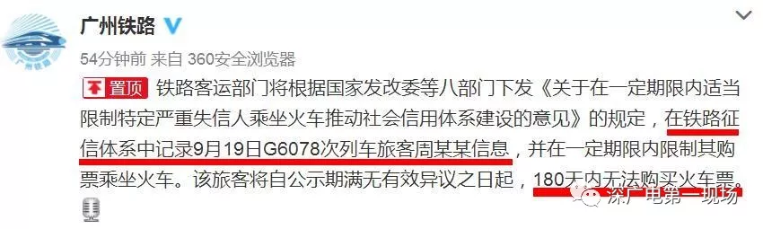 据@广州铁路今天上午10点25分通报称,铁路客运部门将根据国家发改委等八部门下发《关于在一定期限内适当限制特定严重失信人乘坐火车推动社会信用体系建设的意见》的规定,在铁路征信体系中记录9月19日G6078次列车旅客周某某信息,并在一定期限内限制其购票乘坐火车。