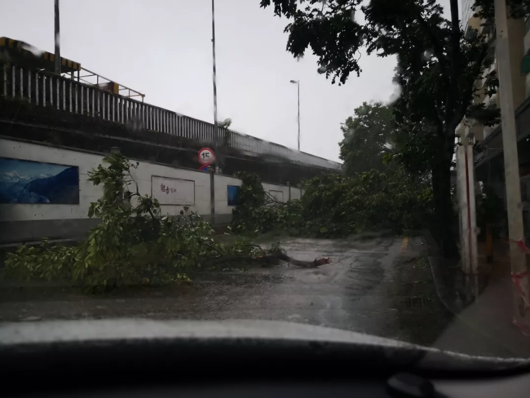 9月16日台风侵袭深圳,下午1点半左右,南园所徐涛副所长带领民警在街面查看灾情,路面满地狼藉,被风刮断的树木横七竖八,挡住许多车道。