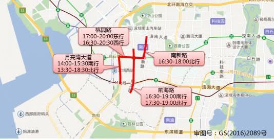 桃园路(17:00-20:00东行,16:30-20:30西行),月亮湾大道(14:00-15:30南行,13:30-18:30北行),南新路(16:30-18:00北行),前海路(16:30-19:00南行,17:30-19:00北行)。