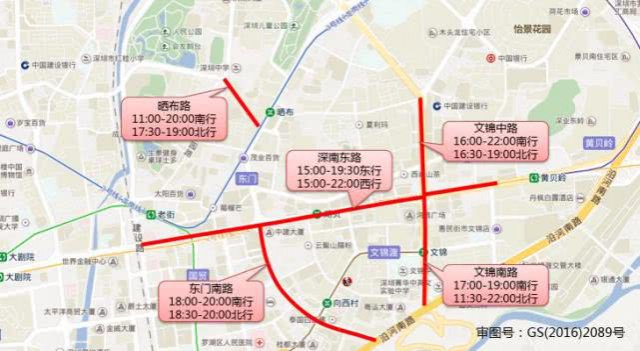 晒布路(11:00-20:00南行,17:30-19:00北行),深南东路(15:00-19:30东行,15:00-22:00西行),文锦中路(16:00-22:00南行,16:30-19:00北行),文锦南路(17:00-19:00南行,11:30-22:00北行),东门南路(18:00-20:00南行,18:30-20:00北行)。