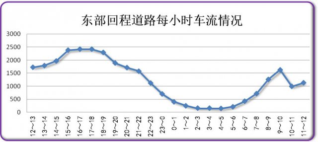今日上午8时开始,东部回程的车辆增多,9时达到峰值,约1629辆。