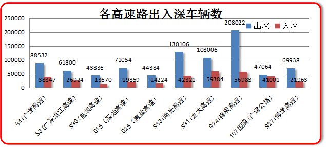 从车辆的流向看,由深圳东部出深(深汕、惠盐、博深、惠深沿海)的车辆约21.99万辆;由东部入深约8.3万辆。由深圳中部出深(梅观 -莞深)的车辆约20.8万辆;由中部入深约5.7万辆。由深圳西部出深(107国道、广深、沿江、南光 -龙大)的车辆约44.48万辆;由西部入深约19.47万辆。