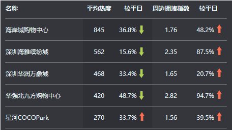 22日12时至今日12时,全市各大型商圈周边道路交通压力较平日有所上升,拥堵高峰出现在22日16时至18时,热门大型商圈周边道路较为拥堵的有:华强北九方购物中心、深圳海雅缤纷城和海岸城购物中心。