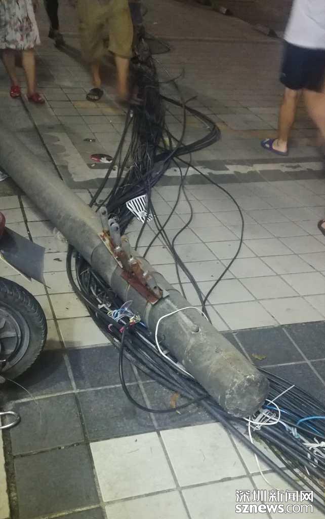 24日,据网友爆料称,在宝安区石岩街道应人石社区天宝路,路边有电线杆受台风影响倒下,超100米的输电线路拖在地上。爆料中称:“有些电线都快碰到行人的头了!”行人纷纷担心该路段是否存漏电隐患。而一周过去,并没有相关部门出面进行处理。