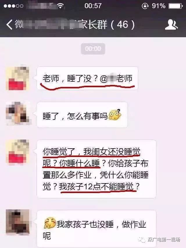 微信的内容是这样的,家长问:"老师,睡了吗?"老师看了之后回了句"睡了,怎么有事吗?"没想到家长的回答是"你睡觉了,我闺女还没睡觉呢?你睡什么睡?你给孩子布置那么多作业,凭什么你能睡觉?我孩子12点不能睡觉?"
