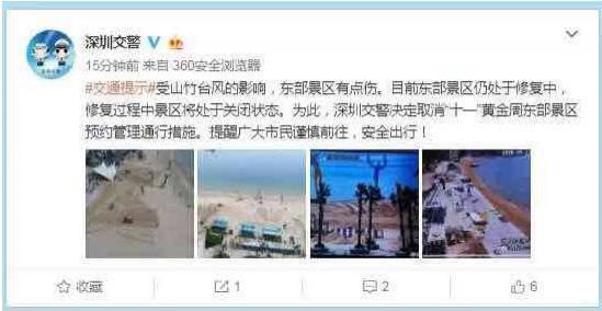 今日(9月25日)深圳市交警局宣布,由于台风"山竹"对东部景区破坏严重,目前部分景区仍在抢修中。交警蜀黍经过综合考虑,决定取消国庆期间前往东部的预约措施。