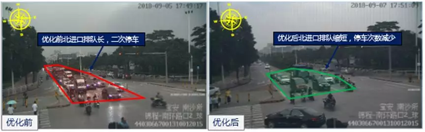 锦程/沙井南环路口为主、次干道交叉口。为提高通行效率、降低延误,9月7日,深圳交警优化该路口配时方案。考虑到车流主要集中在锦程路,取消沙井南环搭接,对锦程路采取搭接相位放行模式,优化后,晚高峰期间路口北进口排队车辆从25辆降至15辆,降幅40%,路口总延误从53s降至40.3s,降幅23.6%。