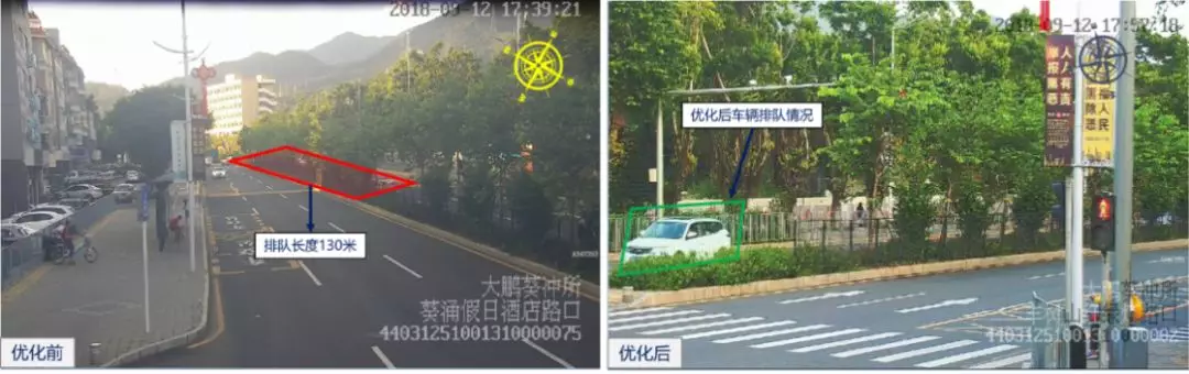 坪葵/丰树山路口晚高峰时段南进口左转、掉头车辆通行需求大,排队长度可达130米。9月12日,深圳交警对路口17:20至18:30期间的配时方案进行优化,增加南直左单放绿灯时间,压缩南北对放绿灯时间,优化后,左转车辆均可一个周期内清空,排队长度缩短96%。