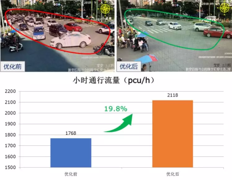 公园路为宝安中心城区主干道,为减少车车交织、改善行车秩序,9月11日,深圳交警将该路口由原先南北早起迟断、东西对放的相位调整为北、东、南、西顺时针轮放的4相位放行模式,优化后,东西、南北行车秩序明显改善,车车交织现象消失,小时通行流量由1768pcu/h提高至2118pcu/h,提升约19.8%。
