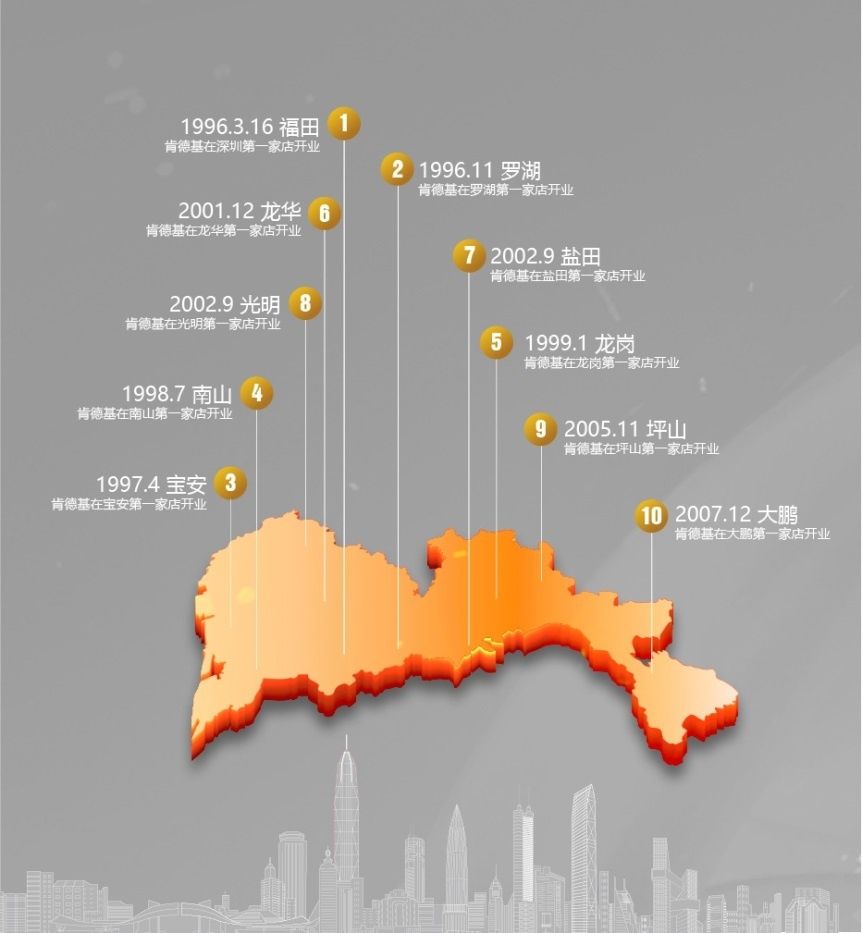 2007年,是深圳的大年份,也是肯德基的大年份。2007年,深圳人均GDP达到10684美元,首次超过1万美元。肯德基的开店数量也在那一年突破了100家,达到108家。同时,肯德基完成了对现在深圳十区的开店布局。