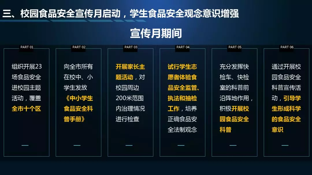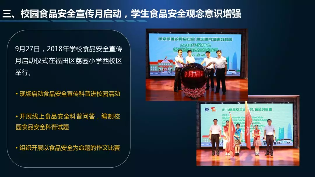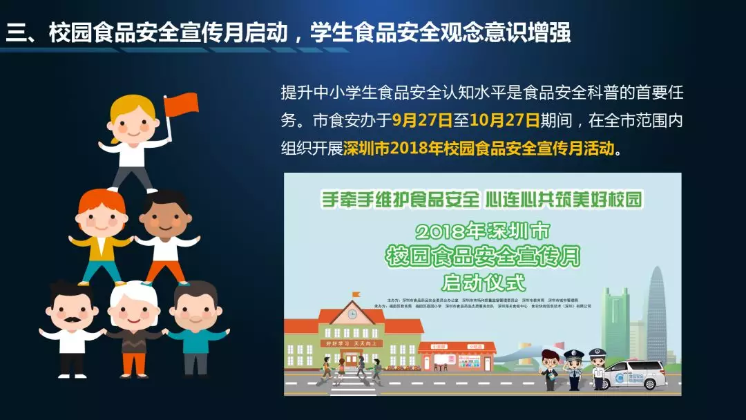 第一个“3”指“九号查酒”节前专项行动、校园食品安全宣传月、深圳市食药志愿者总队开展打击非法售卖活禽专项执法行动等情况通报;