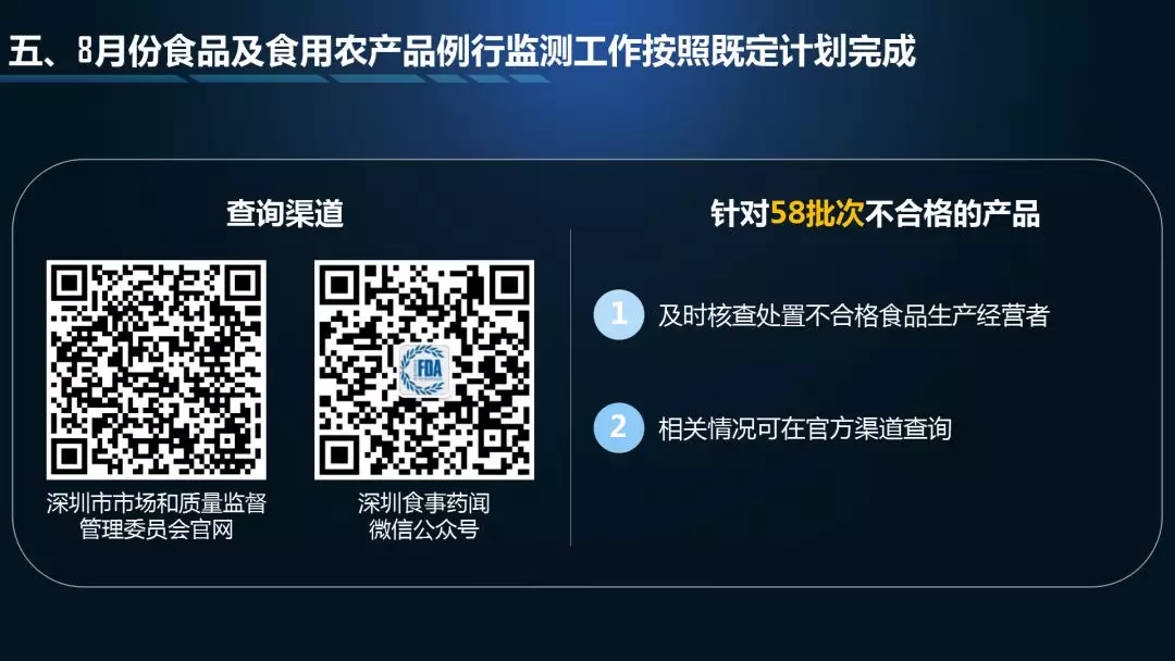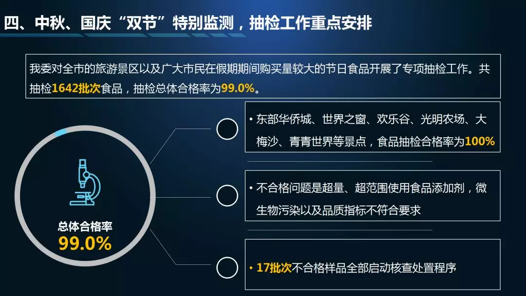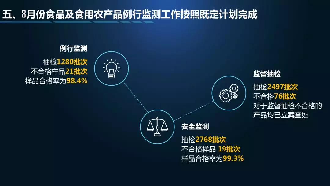 第二个“3”是三项检测结果通报,分别是中秋、国庆的特别监测通报,8月份食品例行监测通报,8月份食用农产品例行监测通报;