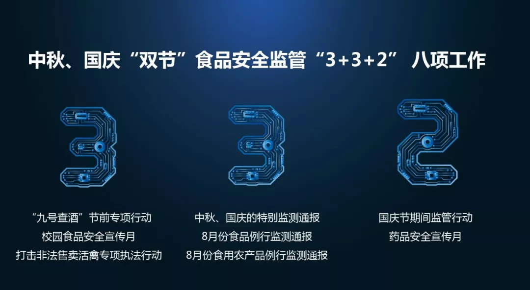 发布会对中秋、国庆“双节”食品安全监管“3+3+2”共八项工作进行发布: