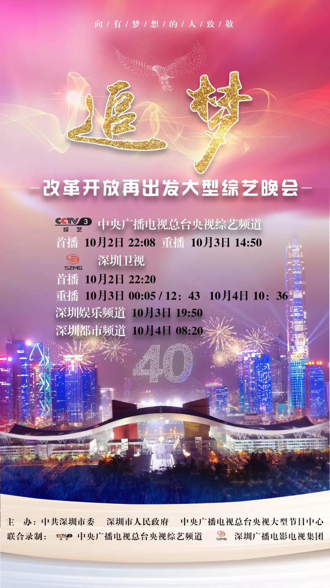 9月20日在深圳举办的庆祝改革开放40周年大型综艺晚会“追梦——改革开放再出发”,将于10月2日22:08在中央广播电视总台央视综艺频道、22:20在深圳卫视播出。