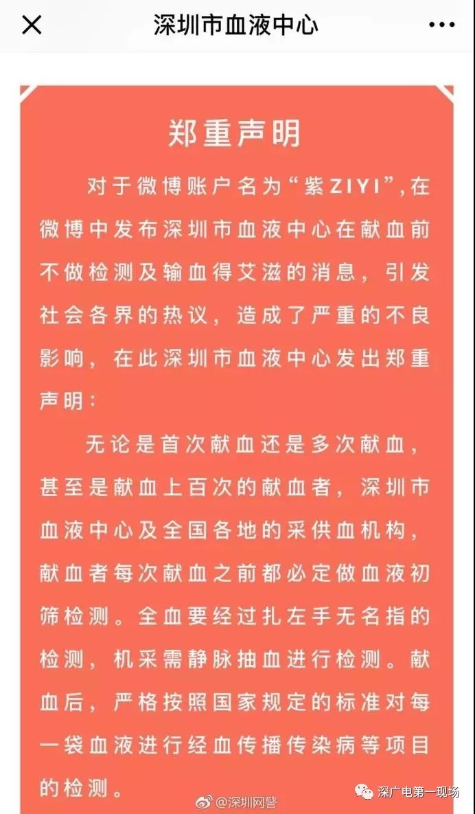 事发后,深圳市血液中心也在第一时间,发出郑重声明:无论是首次献血者还是多次甚至是上百次的献血者,每次献血都必须做初筛检测,全血要经过扎左手无名指的检测,机采需静脉抽血进行检测。献血后,严格按照国家规定的标准对每一袋血液进行经血传播传染病等项目的检测。