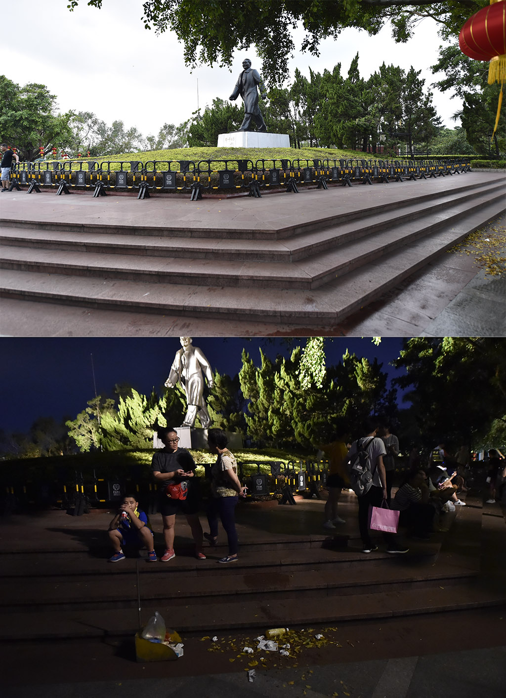 邓小平雕塑右侧,灯光秀结束后垃圾迅速被责任环卫工人清扫
