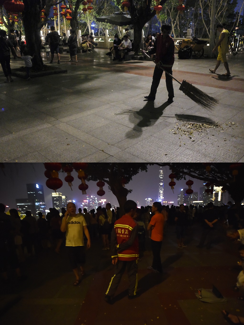 环卫工人在灯光秀期间也在巡查是否有垃圾,并在灯光秀结束后清扫