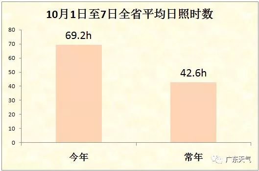 10月1日到7日,全省平均日照时数:今年69.2h,常年42.6h,1951年以来排名第一。