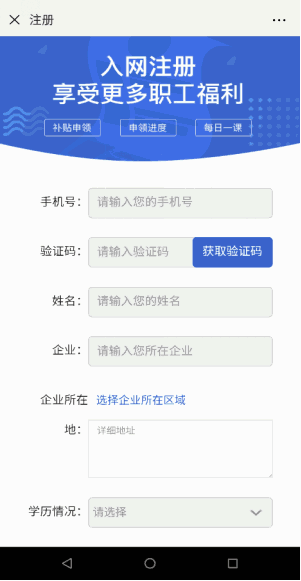第二步:进入注册页面,使用手机号及验证码注册/登陆,选择相应的补贴(“提升学历”或“提升技能”)项目;