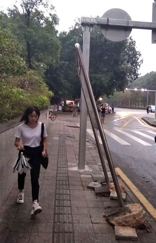 存在安全隐患的不仅电线杆,记者在莲花山公园附近一人流量较大的十字街头发现,有一块交通路牌也被“山竹”吹的东倒西歪,其底部根基已经翻出一半,让人担心其会随时倒下、危及过往路人安全。“我每天上下班都会经过这里,骑着车又不得不走路牌内侧,每次都有点小怕,担心牌子会突然倒下砸到我。”附近的居民向记者吐槽道。