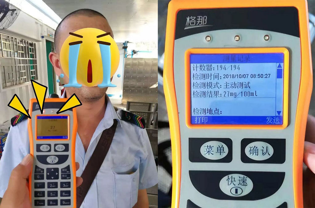 深圳交警到达现场后,再对何某平进行现场主动式酒精测试仪检测,结果显示其酒精测试值显示为27mg/100ml,达到酒后驾驶的标准。