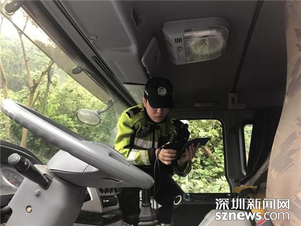 交警进入泥头车驾驶室,检查驾驶室GPS是否按规定使用