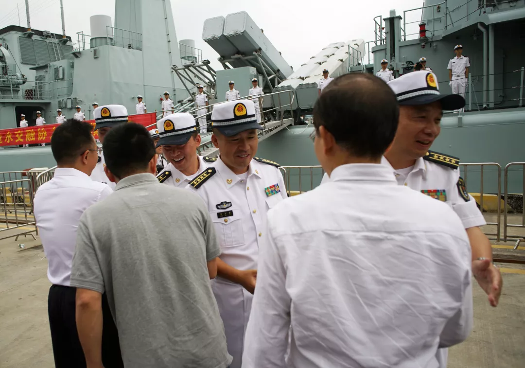 深圳市委副秘书长刘平生,市民政局局长廖远飞,南山区委常委、宣传部部长廖子彬,南山区委常委、人武部部长彭耀玖,副区长谢炳文等领导代表市、区双拥办在码头上欢送深圳舰。南部战区海军副参谋长李晓岩少将,深圳舰所在某驱逐舰支队副政委蒋军大校,深圳舰舰长黄北奇大校,深圳舰政委陈永强上校等与深圳亲人一一握手道别。