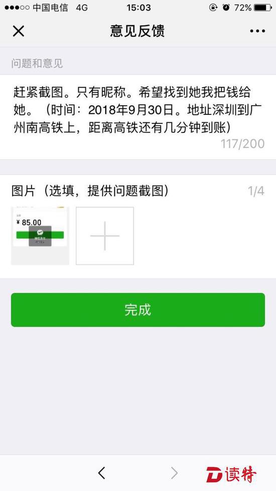深圳新闻网讯 深圳市民李先生高铁上补票,因为没带现金,向一位女乘客借了85元现金,他用微信向女乘客转账时,由于高铁上手机网络不好,还没等转账成功,女乘客就匆匆下车了。这件事让李先生耿耿于怀,希望市民网友帮忙寻找这位好心女乘客,让他能把85元还给她。