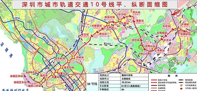 地铁10号线全长29.2千米,起自福田区福田口岸站,终至龙岗区平湖中心站,南北向贯穿深圳市区,全部采用地下敷设方式。