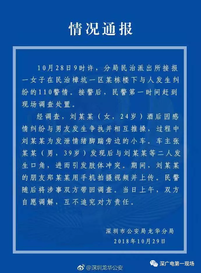 据了解,事件发生在深圳龙华区民治街道樟坑一区,视频中灰色衣服的男子是白色小车的车主,在与一名男子及一名女子发生争执之后,这两人的朋友在一旁拍摄视频,视频拍摄者也和小车车主发生了言语冲突。