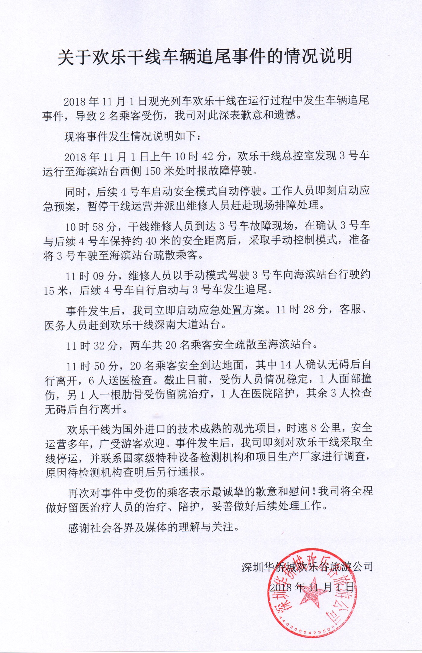11月1日19时,欢乐谷旅游公司发布追尾事件情况说明,并向受伤乘客表示歉意。目前欢乐干线已全线停运。