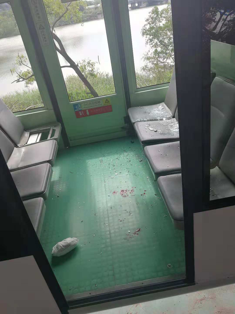 记者从欢乐干线观光车上一位乘客拍摄的视频中看到,这次撞击将车身玻璃撞碎,玻璃渣掉落一地,中间还掺杂了血迹。坐在其中一列车上的乘客惊魂未定。可听到乘客在交流:“你撞到了吗?”“我撞到膝盖了。”在视频中,记者还看到有一人站在两节列车中间,看似正在检查车辆情况,像是工作人员,他说:“我也没想到这个会撞上来。”