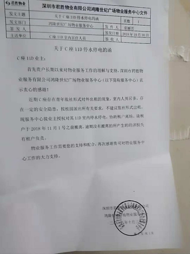 10月30日鸿隆世纪广场物业服务中心物业发出关于 C座11D停水停电函,表示 C座存在青年旅社形式对外出租的现象,室内人员居多,存在安全隐患,按桂园派出所有关要求,不建议旅社形式出租。业主授权物业中心对11D进行室内停水停电,协助租户离场,并要求租户于11月1日之前搬离。