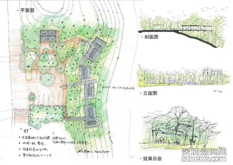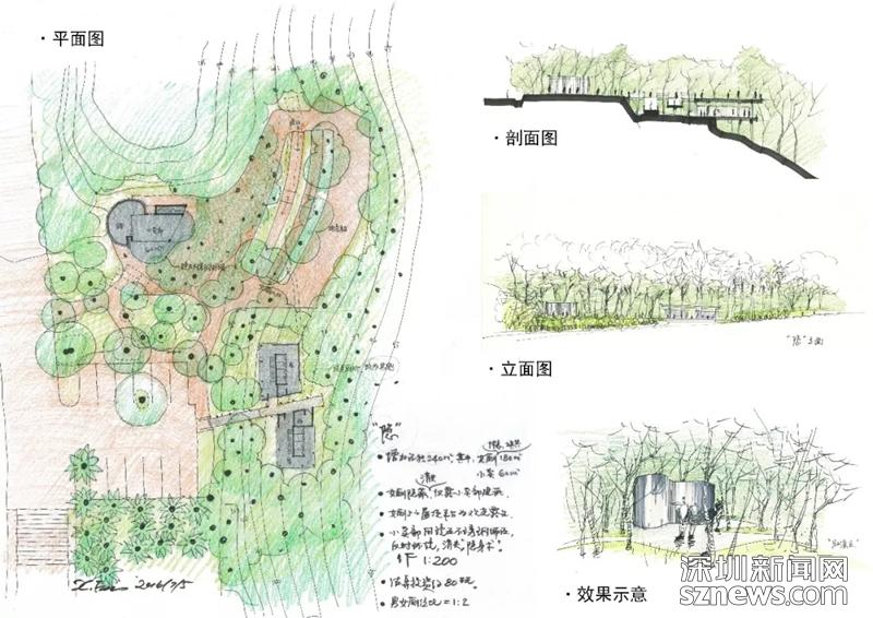 费晓华在文中提到,“随着深圳人口和游客的剧增,莲花山顶公共厕所已不堪负重,急需扩大规模。2016年,本人受莲花山公园管理处的邀请,免费为他们提供了改扩建方案。方案共有两种思路:‘隐扩’和‘显扩’,均是在保留原建筑的基础上,扩大使用面积以满足更多人的需求。从更好地保护自然环境的角度出发,本人推荐‘隐扩’方案。” (附设计图)