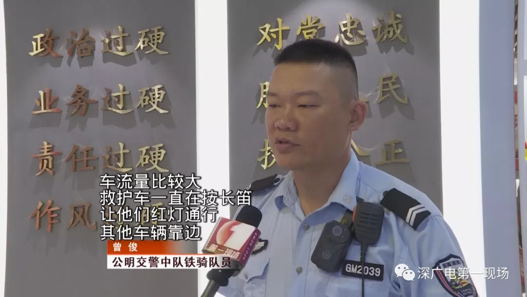 在场的四名铁骑队员立即进行分工,在救护车被堵的红绿灯口,其中一名铁骑,曾俊首先对救护车前方等待红灯的车辆进行疏导。
